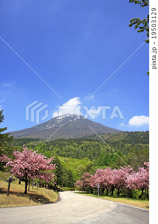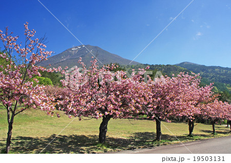 福島県耶麻郡猪苗代町長田天鏡台 昭和の森天鏡台の八重桜関山並木と残雪の会津磐梯山の景色