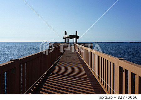晴れ渡った日本海に突き出した夕凪の橋(新潟県出雲崎町)