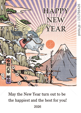 2026年賀状テンプレート「ゴールドペガサス」ハッピーニューイヤー 英語添え書き付パターン