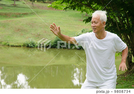 asian senior performing taichi