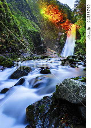 宮城県仙台国指定名勝秋保大滝の夕暮れのライトアップで七色に輝く滝で心と身体を休め癒される観光スポット
