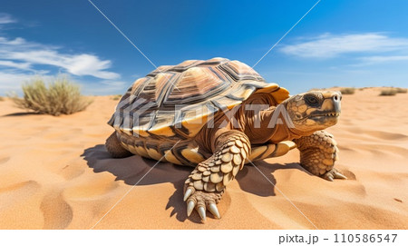 Closeup image of a tortoise in a desert. Wildlife image of a tortoise in a dry grassland. Portrait of a tortoise in the wild. Beautiful turtle in an arid grassland.