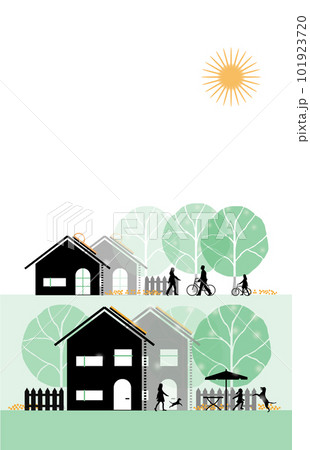 桜満開のエコ住宅の街並み(ピンク+緑・縦向き)