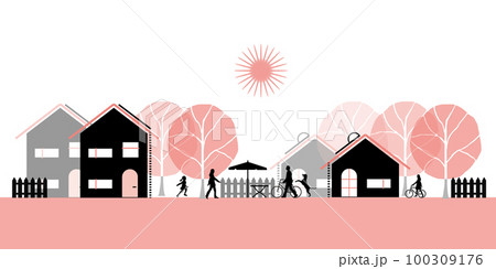 桜満開のエコ住宅の街並み(コーラルピンク)