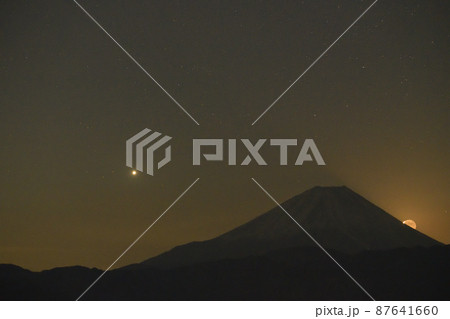 北杜市長坂町、富士の上、夜明けの空に輝く明けの明星とさそり座