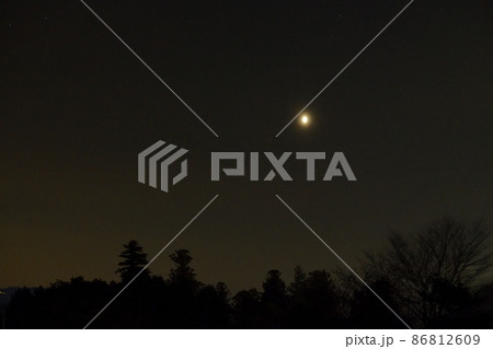 富士川町高下、富士の裾野から昇った明けの明星と地球照の細い月