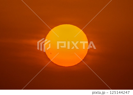 日本の横浜都市景観 黒点…澄み渡る空に真っ赤な朝日が昇る。太陽の中に巨大な黒点が見える=17日
