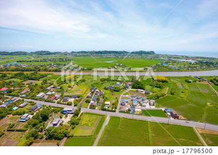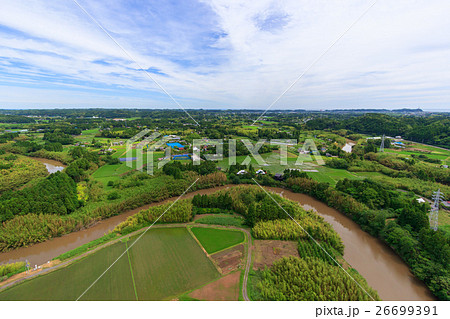 いすみ市 夷隅川周辺の田舎の風景を空撮