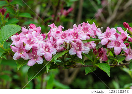 ガーデンで美しく咲くピンク色のオオベニウツギの花