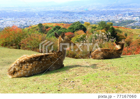 紅葉の若草山山頂から望む奈良市街地風景と鹿の親子