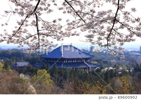 奈良奥山ドライブウェイから見た満開の桜と東大寺大仏殿