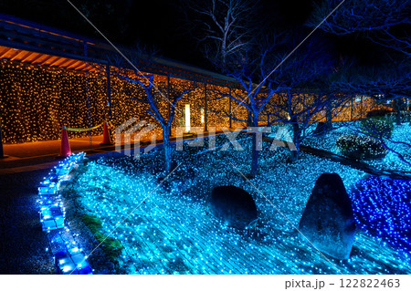 2025年 なら瑠璃絵 回廊を照らす橙色の電球と庭の青っぽいイルミネーション