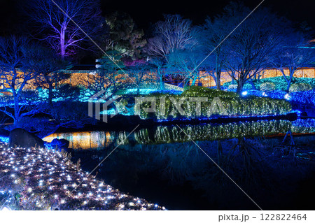 2025年 なら瑠璃絵 池に映るイルミネーションを受けて輝く落葉樹