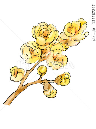 咲き誇る蝋梅の手描きの線画と水彩イラスト
