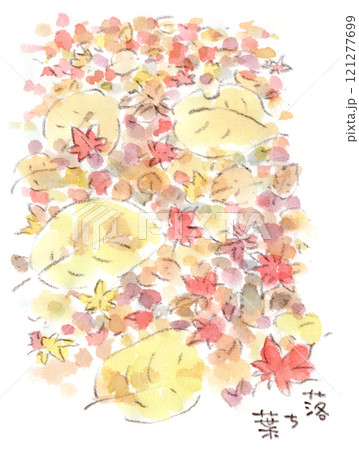 秋の落ち葉の絨毯(モミジ、モクレン、ケヤキ)の水彩画イラスト