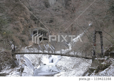 凍結した真冬の「袋田の滝」近くのつり橋と観瀑台