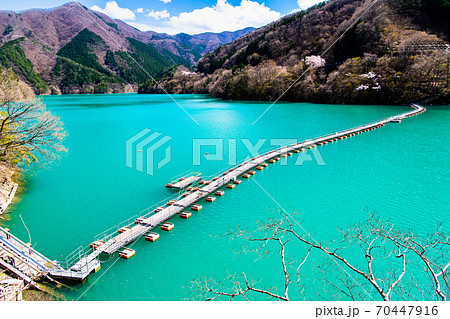 東京都奥多摩町 奥多摩湖と桜(留浦の浮橋)