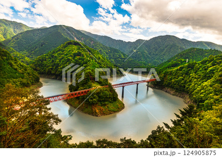 静岡県川根本町 奥大井湖上駅の鉄橋とエメラルドグリーンの大井川