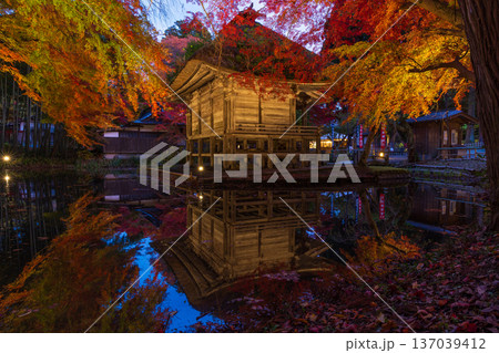 秋の岩手県平泉 世界遺産中尊寺 夜間ライトアップ「紅葉銀河」 弁財天堂