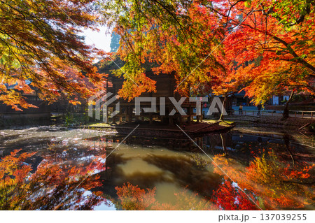 秋の岩手県平泉 紅葉の世界遺産中尊寺 弁財天堂