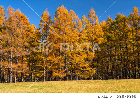 晩秋のカラマツ林の三本松園地の風景