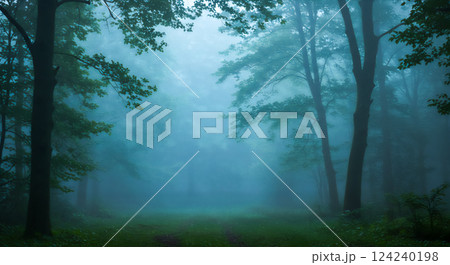 苔むす森の光差す風景・静寂なグリーンフォレスト背景