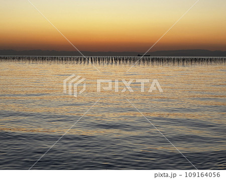 海苔養殖の支柱が並ぶ知多半島の海と夕焼