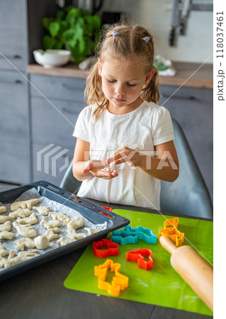 Little girl making cookie with dough using animal shape cutters in the home kitchen, Family concept