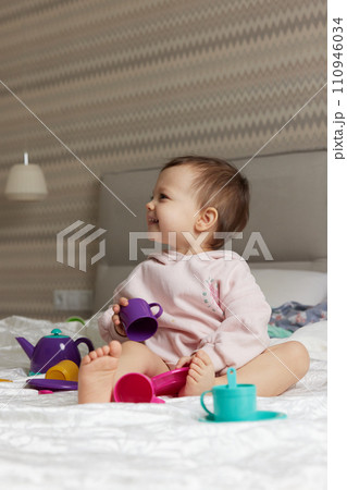 happy cute little child girl playing and pretending drinking tea from toy cups on bed