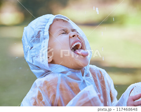 Girl, tongue and raincoat in outdoor nature, cover and jacket to protect in rain weather. Female person, child and play in park or weekend vacation, childhood and having fun in garden for rainfall