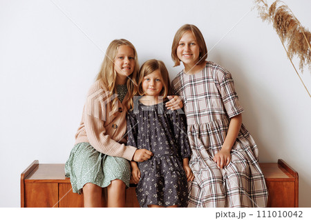 Three young girls, sisters embracing affectionately