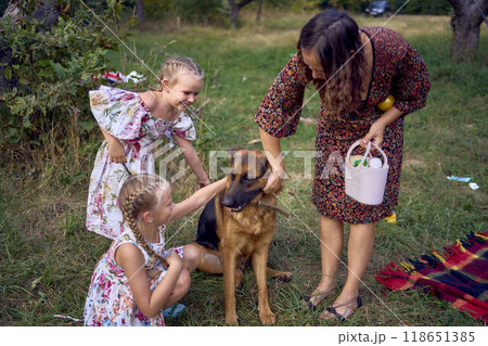 mom and little girls sisters playing with german shepherd dog during easter picnic in the garden