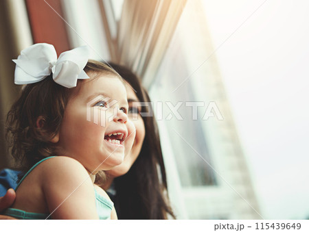 Mother, baby and glass in apartment with window, love and family bonding with view together or girl toddler. Childhood development, growth and curious or caring, woman and parenthood in house