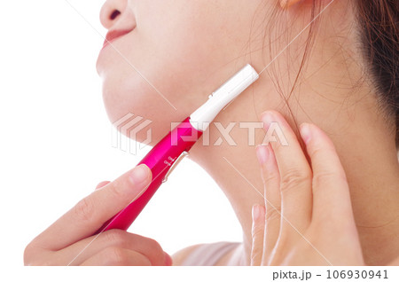 顔のムダ毛を電動トリマーで処理する女性