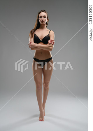 Full-length portrait of a confident woman in black lace lingerie standing on a gray studio background.