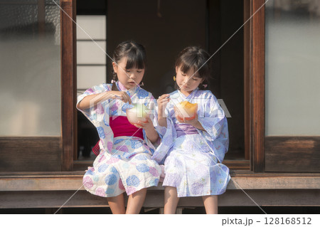 夏の高原の湖で浴衣を着た日本人の小学生の女の子がかき氷を食べている風景