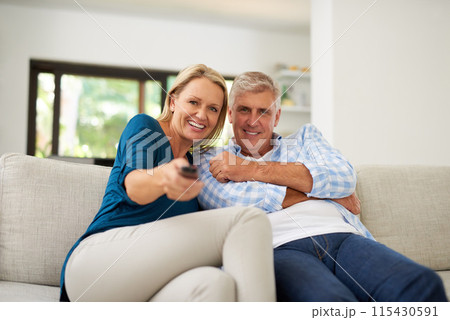 Sofa, couple and portrait with tv remote in living room for streaming service, entertainment and search. Mature man, woman and relax at home with television for online movie, film and media broadcast