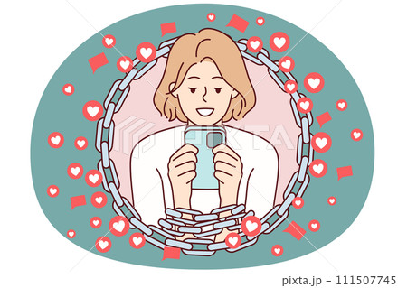 Woman with chained hands using phone symbolizing addiction to internet and gadgets. Vector image