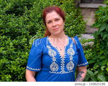 A woman in a blue embroidered dress stands near green foliage with a calm expression. Lifestyle portrait, individuality, and natural harmony of human presence with summer greenery.
