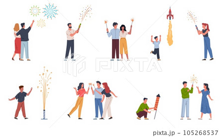 People launching fireworks. Holiday explosions, parents and children with crackers, beautiful sparklers and salutes, man and woman watching lights. Cartoon flat isolated nowaday vector set