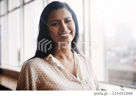 Smile, office and portrait of business woman with confidence for startup creative career. Happy, pride and professional mature female copywriter with positive attitude at workplace in Colombia.