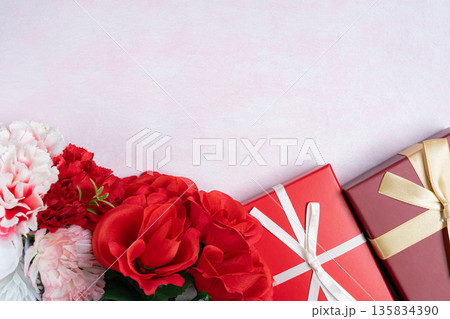 バレンタインのギフトボックス 赤いプレゼントと花のイメージ