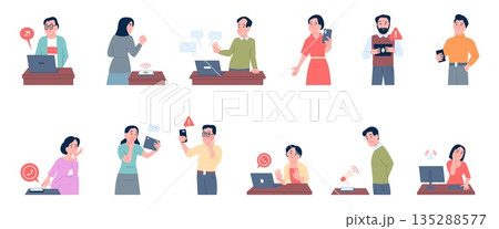 People scared gadgets. Office workers waiting call or message, feeling stress, negative reading news or email. Men women frustration from smartphones, recent vector scenes