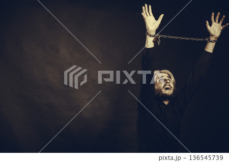 a businessman breaks the chains, a symbol of freedom and struggle against economic and political ties. Citizen and his rights
