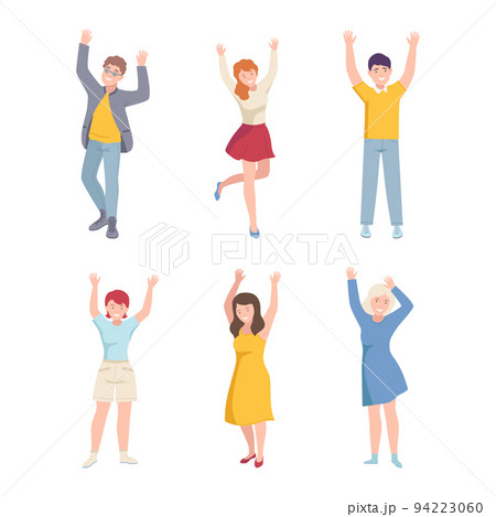 Joyful People Character Standing with Raised Up Hands Cheering About Something Vector Set