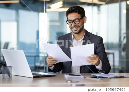 Successful mature experienced financier on paper work, Arab smiling satisfied with results of financial achievement, reviewing contracts, invoices and statements with accounts, businessman in suit.