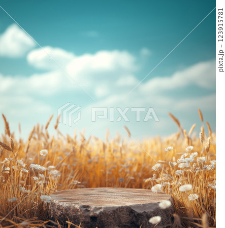 Empty round brown stone podium in the wheat field with daisies against sky background