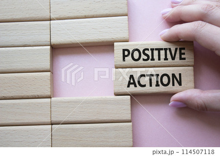 Positive action symbol. Concept words Positive action on wooden blocks. Beautiful pink background. Businessman hand. Business and Positive action concept. Copy space.