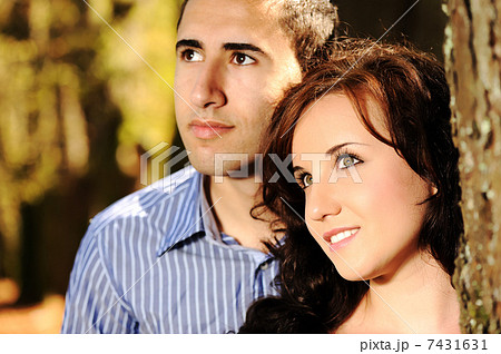 Good-looking contented young couple enjoy their fir tree selected at forestry during preparation for holidays.