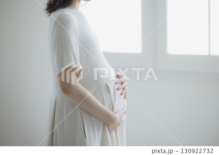 赤ちゃんを想像してお腹に手を当て微笑む妊婦
